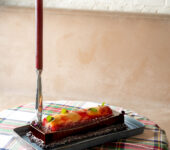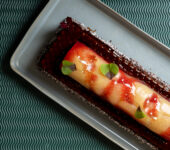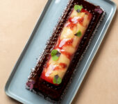 Découvrez notre buche Poire délice choco hibis. Cette buche est composée de poire conférence de Temploux et hibiscus, d’une mousse et crémeux au chocolat, un biscuit brownie, un shortbread cacao.