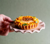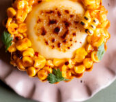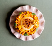 Découvrez le Chica, une création qui vous fera voyager à travers les saveurs du Mexique. Il est composé d’un flan maïs façon crème brulée, d’une pâte filo poivre fumé, piment doux et d’une pralinade maïs, huile anis étoilé et coriandre.
